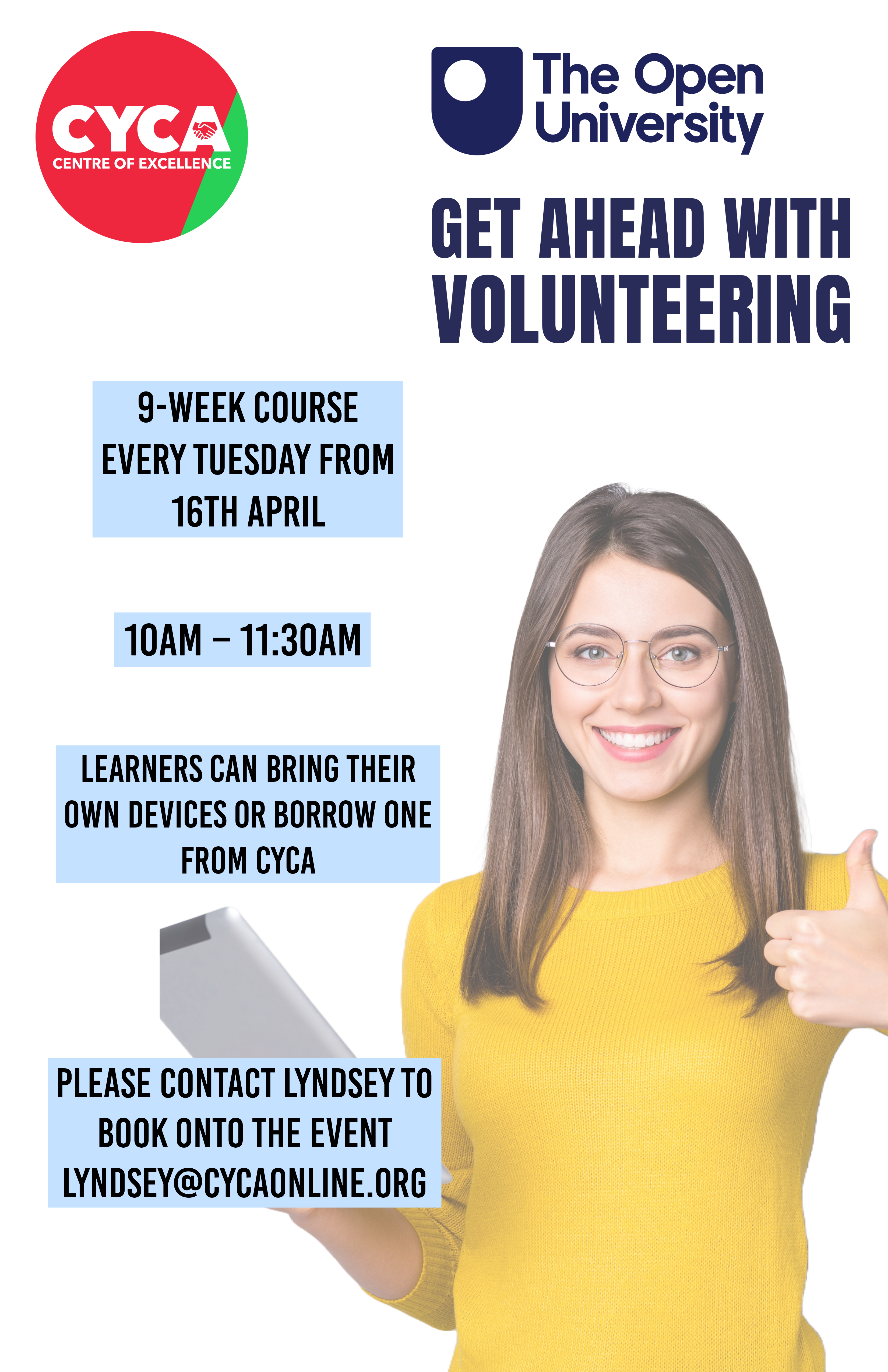 CYCA will be holding a Get Ahead With Volunteering course with the Open University at our CYCA offices on the 16th April.