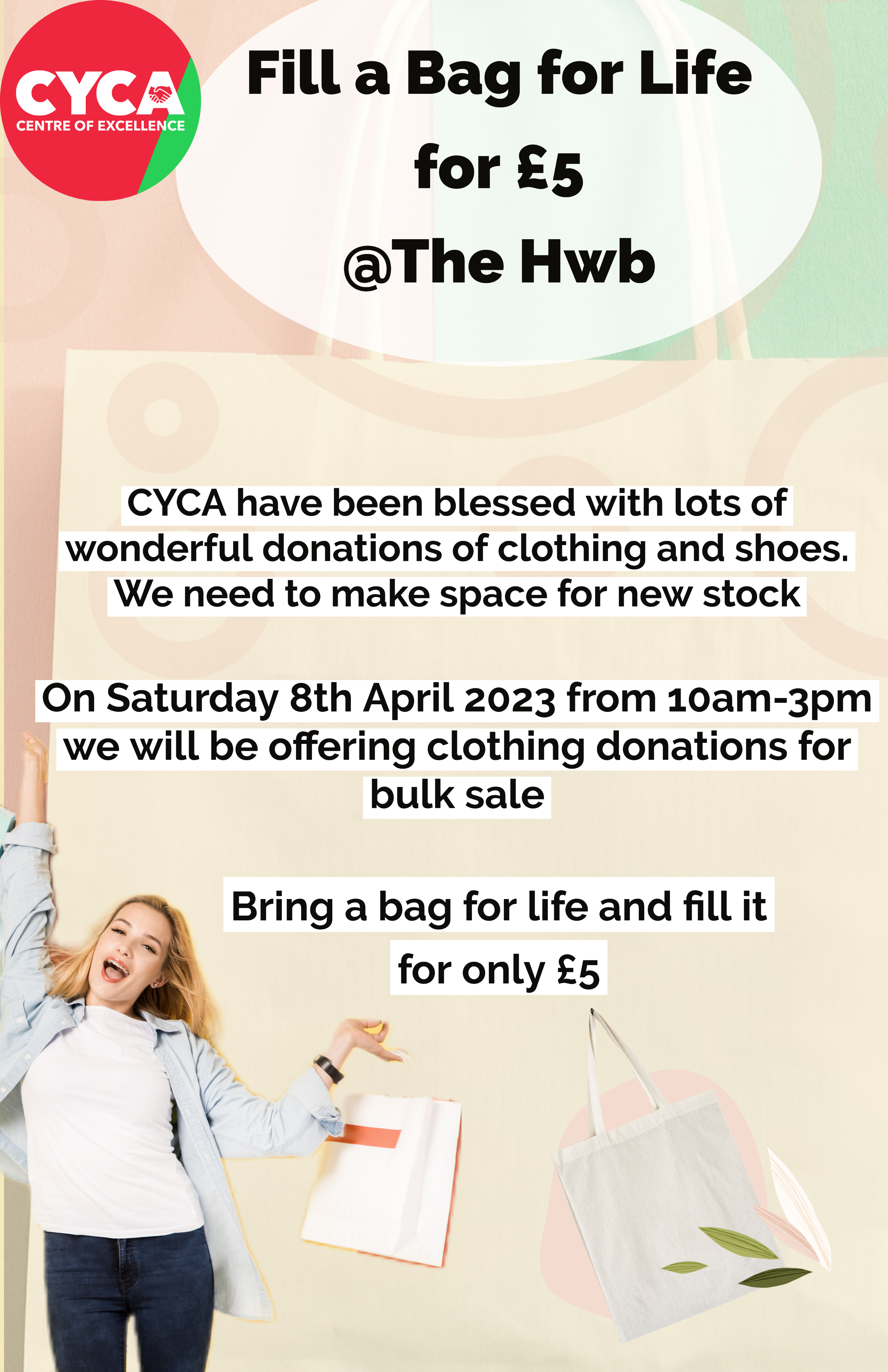 We will be running our fill a bag for life with clothing for £5 event again on the Saturday 8th of April! Come on down to the CYCA Hwb in Llanelli town centre to grab yourself some bargains!